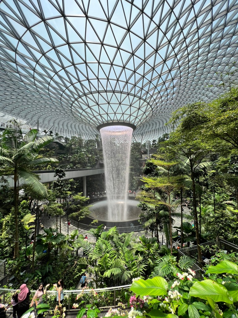 Tìm đến được chiếc thác nước thì cả hai đứa chúng mình đều wow vì độ đẹp và hoành tráng của thác và hệ thống cây cối được người ta ươm trồng, chăm sóc xung quanh. Tất cả khiến Jewel Changi Airport trở thành một trong những điểm “phải đến” của chuyến du lịch Singapore. Tuy thác là thác nhân tạo, nhưng cách họ thiết kế thác đi kèm theo hệ thống cây hoa và bụi cây xung quanh, thực sự đã mang lại không gian siêu xanh và đẹp cho cảnh quan sân bay này.