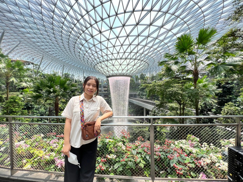 À có một ghi chú nho nhỏ là tầng 2 của Jewel Changi Airport thường rất đông, hành lang chụp ảnh khá hẹp, nên sẽ khó bắt được góc ảnh đẹp mà không có người. Hành gợi ý cậu di chuyển lên tầng 3 để vắng người hơn và chụp được chiếc view thoáng hơn nhé! Hành nghĩ tầng 2 đông vì nó là tầng có cầu kết nối trực tiếp từ Terminal 3 sang Jewel và ngược lại thôi.