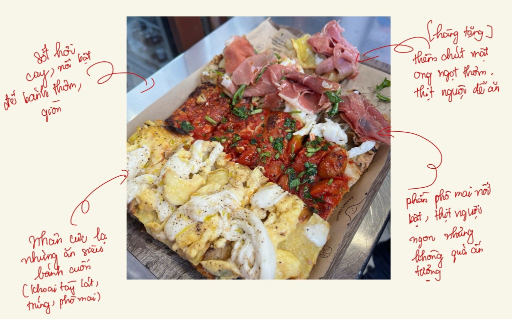 Bọn tớ chọn ra ba vị pizza và được tặng kèm thêm một miếng pizza nhỏ. Thực sự là để kể ra đã chọn những vị gì, tớ xin thua vì không biết gọi tên. Nhưng bên trên, tớ có một bức ảnh minh hoạ review nhanh ba vị tớ đã chọn. Đặc điểm chung thì pizza ở đây đế khá dày, nhưng giòn, không đặc ruột đế và topping thì cực kỳ tươi mới, kết hợp sáng tạo nhưng không kém phần hài hoà. Tiệm lại rất gần Vatican city nữa, nên có dịp ghé Rome, các cậu thử trải nghiệm xem sao rồi review các vị khác cho tớ với nha! Chỉ có một điểm trừ nhỏ là do bánh bán theo kg và là trái ngọt của khả năng sáng tạo topping độc đáo đầy ấn tượng nên giá bánh sẽ có chút cao hơn so với các tiệm khác. Tuy nhiên, mỗi loại pizza sẽ có bảng giá kèm theo, nên các cậu cứ cân nhắc rồi lựa chọn thế nào cho phù hợp hầu bao nhé!