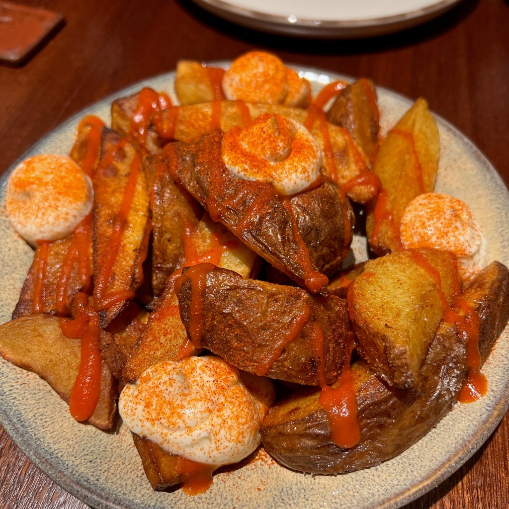 Khác với Muro San Stae, không gian trong nhà của Birraria La Corte rất rộng rãi và ấm cúng. Tranh thủ ăn bữa brunch, bọn tớ đã gọi ngay một chiếc khoai tây sốt (“Bravas” potatoes with aioli and ‘nduja from Spilinga ketchup), một bánh pizza Marinera và một đĩa risotto.
