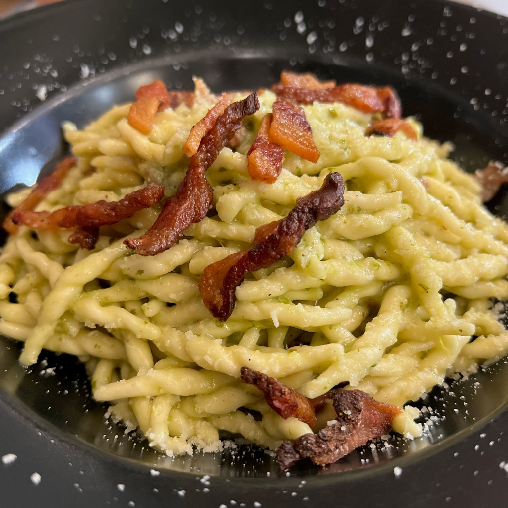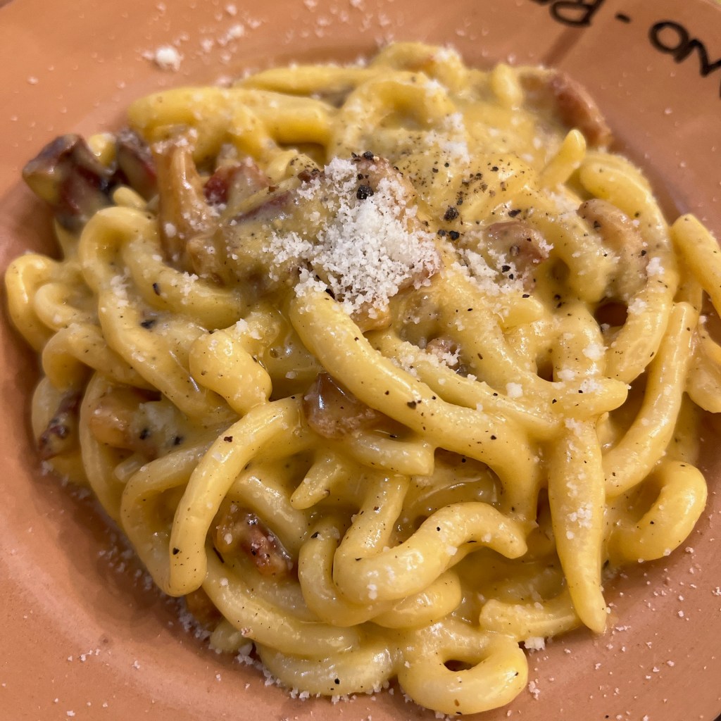 Từ trước giờ, trong tưởng tượng của tớ, mỳ Ý là spaghetti và pasta. Thế nhưng đến nhà hàng này, tớ mới biết thêm đến sợi strozzapreti, hay còn có một cái tên mỹ miều nhưng cũng rợn gáy là sợi mì “vòng cổ thầy tu” do hình dạng xoắn, uốn lượn như vòng treo cổ. Với hình dáng và cấu tạo đặc biệt, dày, xoắn và ngắn, strozzapreti đương nhiên mang lại một cảm giác khác biệt so với spaghetti hay pasta. Không mượt mà hay mềm mại, từng sợ mỳ dai dai, dày dày, ăn rất lạ miệng. Cậu sẽ cần nhai kỹ hơn một chút, nhưng quá trình này cũng giúp chúng mình cảm nhận thêm hương vị đặc biệt cũng như độ thơm ngon của những sợi mỳ tươi ở Ý. Phần sốt carbonara đậm vị phô mai parmesan cực kỳ dễ ăn, hoà quyện với kết cấu của sợi mỳ và những miếng thịt xông khói chiên giòn giúp tổng thể món ăn ngậy, độc đáo, ngon mà không ngấy. Bảo sao, người Ý có thể ăn mỳ suốt thôi!