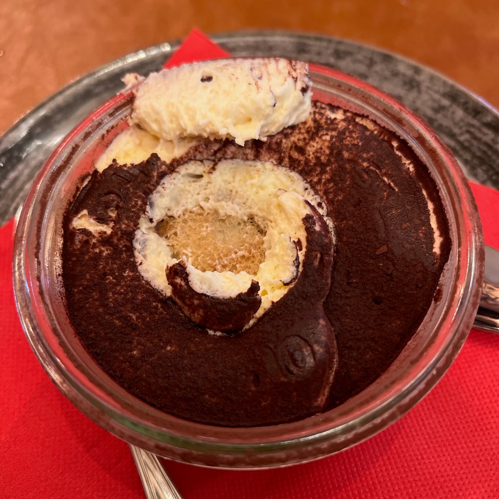 Dù còn thiếu một chút ngậy trong kem để đạt được top 1 như Osteria da Fortunata nhưng chiếc tiramisu ở đây cũng đã khá vừa vặn với từng lớp bánh được thẩm thấu đủ cà phê, thơm mà đắng nhẹ, kết hợp hài hoà với lớp mascarpone béo, thơm. Tỉ lệ phần kem và bánh cũng rất hợp lý, nên ăn bánh cảm giác không bị ngán một chút nào. Một điểm trừ theo kiểu vạch lá tìm sâu thì, do bánh được định hình trong một chiếc ly nhỏ, nên lúc ăn tớ phải xăm soi xem dưới đáy còn gì để vét không, chứ không được dễ nhìn, dễ ăn và bắt mắt như bánh của Osteria da Fortunata.