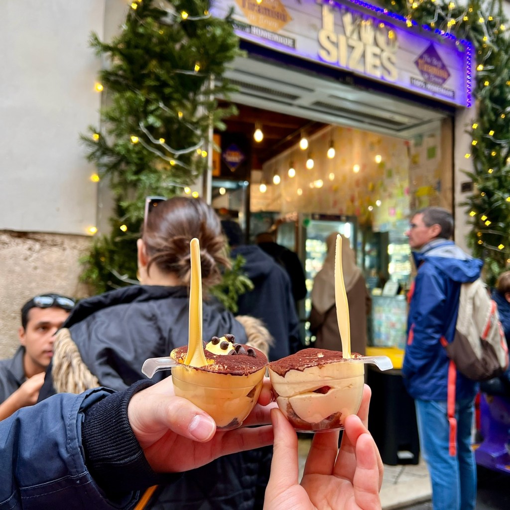 Two Sizes là một trong những tiệm tiramisu nổi tiếng nhất ở Rome, với lượt khách vào ra tấp nập. Điểm đặc biệt của tiramisu ở Two Sizes hẳn là có 5 vị và 2 kích cỡ khác nhau (đúng như tên gọi của cửa hàng) để thực khách thoải mái lựa chọn và trải nghiệm. Ở lần ghé thăm này, bọn tớ có thử 2 vị là truyền thống và caramen. Những chiếc bánh tiramisu được đặt trong các ly nhỏ, xinh xắn dễ thương, với tỉ lệ bánh và kem, nhìn vào ngoại hình cực kỳ cân đối. Vậy nên, tớ đã cực kỳ háo hức khi tìm đến đây.
