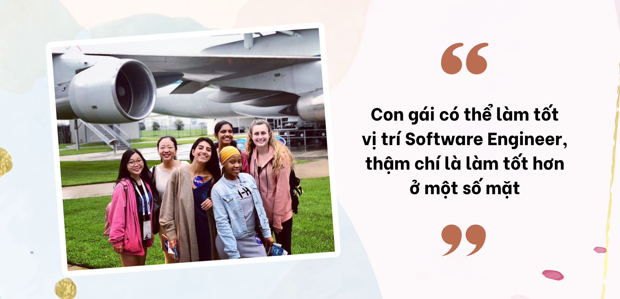 “Năm ngoái, chị có tham gia vào một hội thảo do công ty tổ chức. Lúc đó, có một chị diễn giả là phi công, hình như còn là phi công đầu tiên trong quân đội Mỹ. Chị ấy cũng bảo bản thân gặp rất nhiều sự phản đối từ người thân và bạn bè, rằng ngành ấy không dành cho nữ. Nhưng rồi, chị ấy làm được, thậm chí làm tốt. Như ngành Công nghệ thông tin cũng vậy, chị làm đủ lâu để tự tin nói: Con gái có thể làm tốt vị trí Software Engineer, thậm chí còn tốt hơn ở một số mặt. Quan trọng, chúng mình nên tập trung tận dụng thế mạnh của mình.”