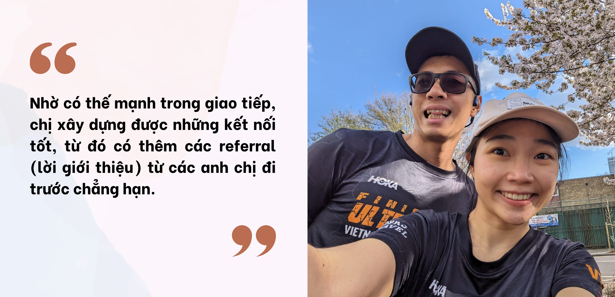 “Như chị, nhờ có thế mạnh trong giao tiếp, chị xây dựng được những kết nối tốt, từ đó có thêm các referral (lời giới thiệu) từ các anh chị đi trước chẳng hạn. Rồi đến khi phỏng vấn, chị sẽ biết cách trả lời sao để thể hiện hết khả năng của mình. Chị nói tốt hơn chồng chị rất nhiều luôn á, kiểu như đôi khi chị sẽ dạy anh ý cách nói chuyện sao cho ấn tượng và tạo thiện cảm nữa (cười).”