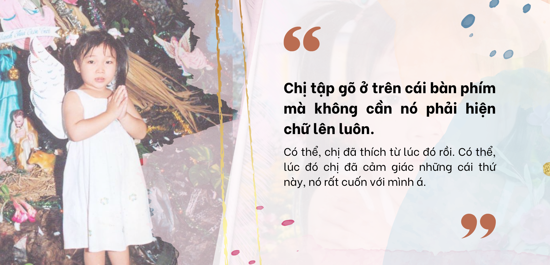 “Nó chỉ có cái màn hình và cái bàn phím, không có cái CPU nên em không thể nào bật lên được đâu. Nhưng mà cũng đủ để khiến chị tò mò. Chị tập gõ ở trên cái bàn phím mà không cần nó phải hiện chữ lên luôn (cười). Có thể, chị đã thích từ lúc đó rồi. Có thể, lúc đó chị đã cảm giác những cái thứ này, nó rất cuốn với mình á. Nhưng mà lúc đó thì chị chưa nhận ra đâu (cười).”