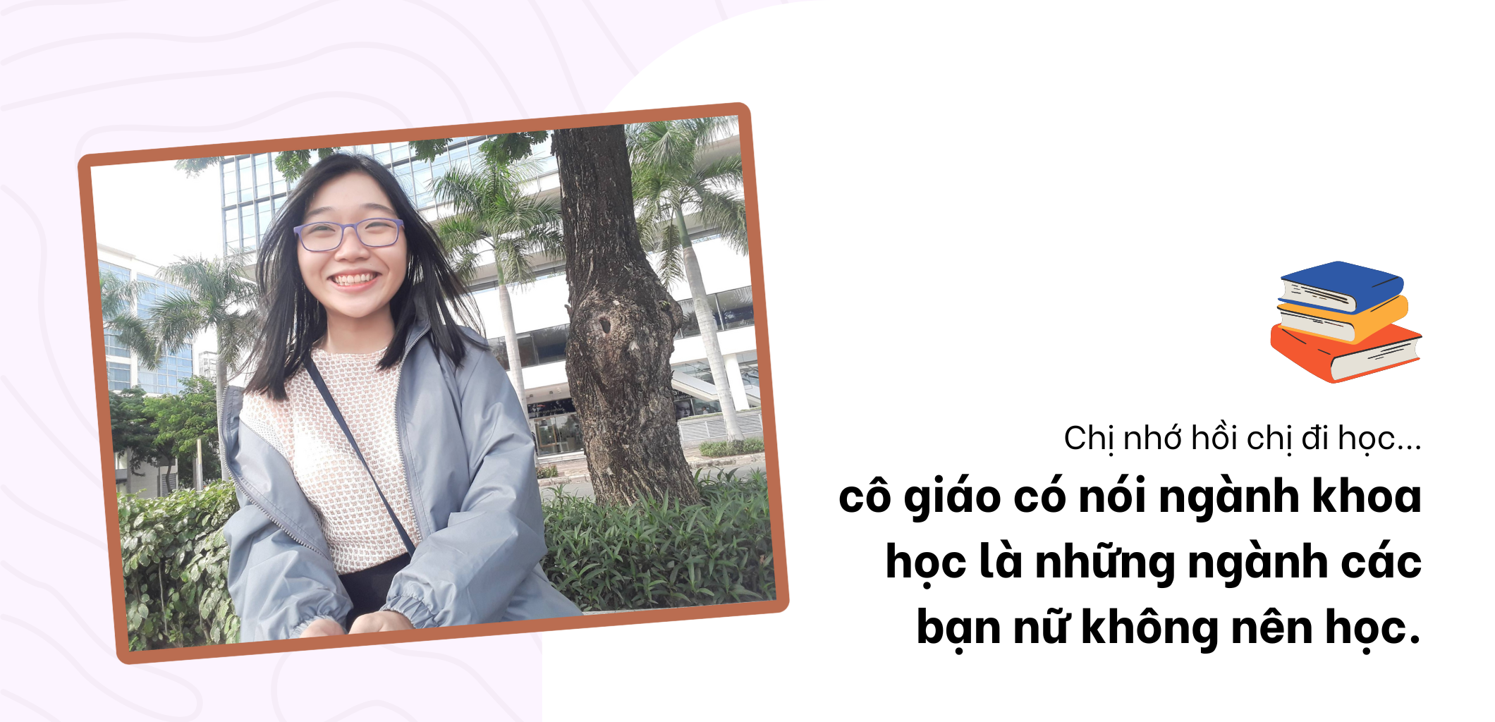 “Chị nhớ hồi chị đi học, cô giáo có nói ngành khoa học là những ngành các bạn nữ không nên học. Cô nói, dưới góc nhìn chia sẻ vì thương học trò, rằng những ngành ấy vất vả. Rằng con gái học xong sẽ mất đi hạnh phúc gia đình, kiểu không thể nào lập gia đình và có con được. Có lẽ đó cũng là một phần lý do ít các bạn nữ theo đuổi ngành này. Bản thân họ đã gặp một cái rào cản rất lớn từ lúc đi học rồi.”