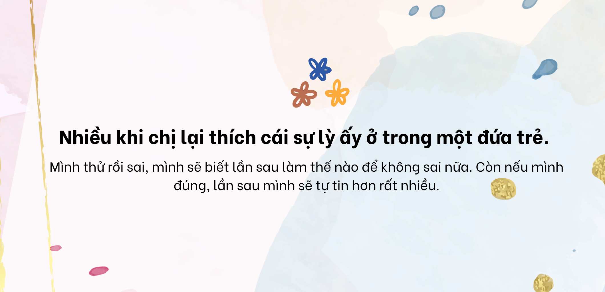 “Nhiều khi chị lại thích cái sự lỳ ấy ở trong một đứa trẻ. Mình thử rồi sai, mình sẽ biết lần sau làm thế nào để không sai nữa. Còn nếu mình đúng, lần sau mình sẽ tự tin hơn rất nhiều.”